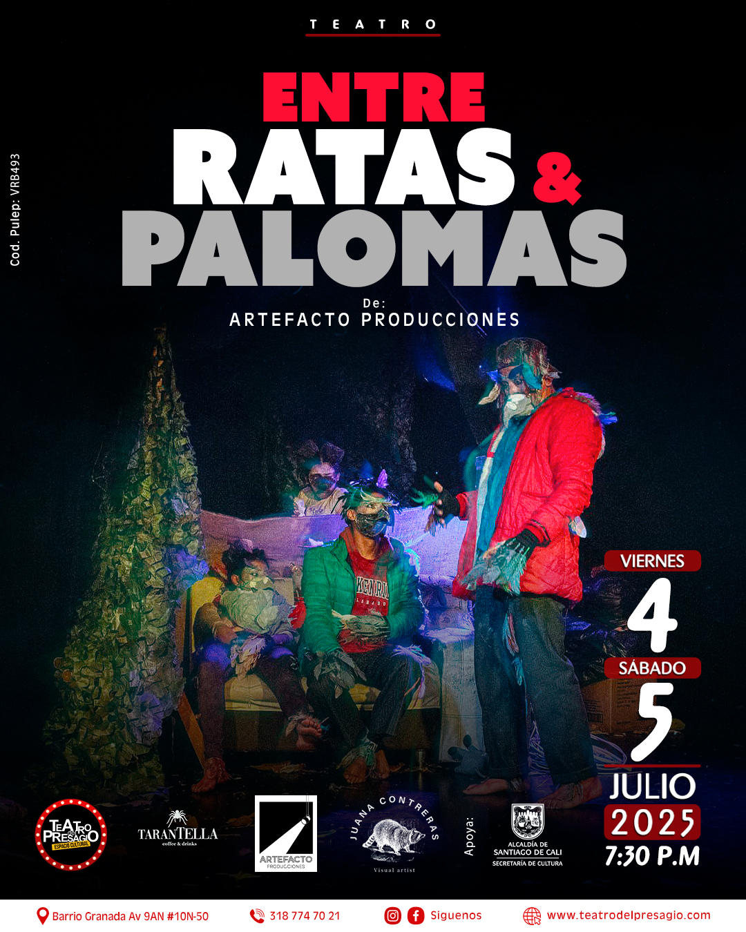 Es una obra que cuenta la historia de un grupo de habitantes de calle en tiempos de pandemia y como hicieron para sobrevivir a este momento. Con el desarrollo de esta trama nos vamos a dar cuenta si lo mas difícil para ellos fue la pandemia o si permanecen en un cumulo de situaciones tan precarias que la pandemia solamente fue una circunstancia mas. Esta historia se vuelve un pretexto para hablar de Colombia, el país de los falsos positivos y sin recuerdos, nuestra hermosa tierra sin memoria, con una diferencia de clases que cada vez se mas marcada por el poder y el dinero. Entre ratas y palomas es un grito desesperado que hace un llamado al entendimiento, al amor y a la educación como único vehiculo de transformación social.