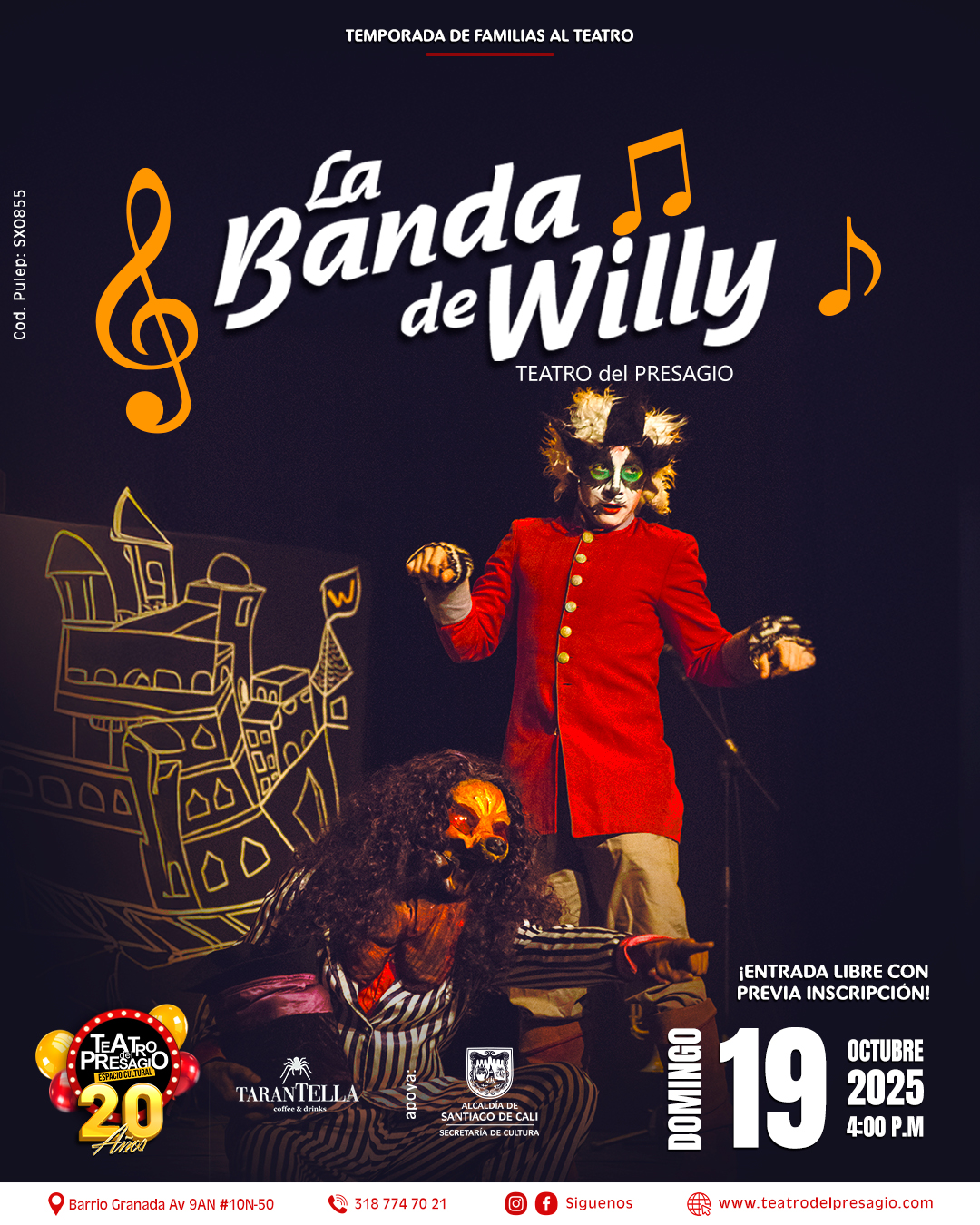 Un hermoso espectáculo lleno de MÚSICA, TEATRO, TÍTERES y sobre todo mucha DIVERSIÓN. Disfruta con los personajes más coloridos y Divertidos de los cuentos Clásicos de la Literatura. ¿Qué pasa cuando el inventivo Pinocho, la histriónica Caperucita Roja, un Lobo fracasado como mago y sus Amigos el Conejo blanco, la Reina de Corazones y el Gato con botas se ponen a tocar en la banda de un Mico llamado Willy La respuesta es ¡Pura diversión! Una fiesta completa con 7 actores y músicos (Batería, bajo teclados, sintetizador, trompeta y acordeón), en medio de un hermoso y divertido concierto. Además de los invitados títeres El Negro Sirilo y Coco su Cocodrilo en divertidas situaciones.